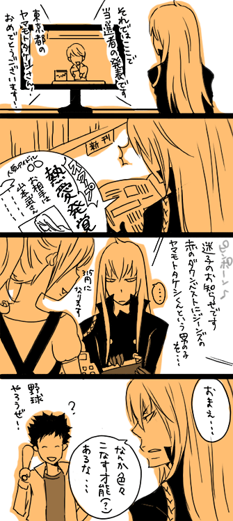 LayercakeボスとドカスのDV劇場 らくがきばかりですが まぁゆっくりしてけやPAGE | 1 2 3 4 | ADMIN | WRITE 2010.01.11 Mon 18:10:04 貴方のためにWinning Run ラブラブゴールに向かって走れ武の顔もやけど髪型もかわいく描かれへんねんごめんやで... でもアニリボ見たんでやっぱりこの2人を描きたかったんや... で、 リアルマグロ 来 る ディーノさんが平静なのは、事前連絡(土産はマグロだぜぇ)を受けていたのかそれとも 昔からスク先生がたずねて来る時には鮮魚を必ず差し入れしてくる習慣なのか とにかく同級生コンビは萌える...というかDノさんの流し目がエロス 久しぶり遅かったなスクアーロ今夜お前を抱・く・ぜ って顔に書いてあったヒェ〜 肝心の、スク先生によるパンチdeラブattackシーンはまぁ無難なかんじで 何でだろう本誌ではそう見えなかったのに、アニメだと本当にマグロと武が 物々交換されていったように見えた...笑った 昨日のインテにて、山ヒバ萌えの友経由でなんと私宛にプレゼントを下さった方が... ここは見ておられないでしょうけどありがとうございます^^^^ これ、スク萌えのお友達に...って なんと親切な!はやくこの手にしたいです 今日は調子が乗らずあまり描けなかったドンマイ 拍手ありがとうございます!つづきおへんじです^^ PR 2009.11.13 Fri 21:23:59 baby baby,冗談なのね口づけは山スク10のお題 5.キス魔 すいませんただのベロチューです(注意)やっつけ絵をいろいろ誤魔化し略 さっき山スク山同盟の名簿に参加したら脱字した (´・ω・`) ああ今週も超ハードだった疲れた…昼休み以降トイレにたつヒマもない そんな日もあった…マジ膀胱が心配 会社の先輩♂が、きー坊はオレの下の名前覚えてるよな!と聞いてきたので、 クソ忙しい時だったんですけどここはボケる所だなと思い、もちろん覚えてますよー! ○○(名字)タケシ と答えたら大ウケで大変喜んでもらえましたよかった 来週も仕事が山積みであるハァァ… 疲れた時には仔スクのことを考えると元気が出ます 何だかんだ言って、仔スクがいちばん好きなのかもしれないです仔スク時代というか 10年後の夫婦なザンスクも大好きなのはもちろんですが、二人がそうなるまでの過程こそが 同人の醍醐味といいますかそこをあれこれ考えるのが楽しいと思ってます そうすると仔ザンスクは出会いから恋に落ちるまでがギュッと凝縮されているわけ ですよね~半年ほどの付き合いの相手を8年も待ち続けるなんて、相当いろいろないと出来ない…(ブワッ) 復活したボスは9代目への復讐に燃えつつも、ずっと待ってたスクたんの健気さにかなりキュンキュンときて、 何かもうドカスがいればいっか…いやいや老いぼれに復讐復讐!となってると かわいい。 拍手ありがとうございます^^^^^^ つづきはおへんじ4545へ 2009.11.11 Wed 21:06:12 ほかほかするよね さあうちにかえろ山スク10のお題 4.年齢差 構図に困ったので山ヒバ萌えの友に相談したら、園児と保父という神がかったシチュを提案してもらった… はじめはちょおまw真面目にwwってなったがじわじわ来た… 武はホント何でも似合うなぁぁぁ!幼児と戯れてるけど実は殺し屋とかぬげーかっこよす… スクたんは、でぃーのがおれのことおよめさんにするっていうんだぁぁって泣いてるんだと思います そういやアニリボの、スク先生星座占い恋愛運◎に喜ぶの図 まだ見てない! 拍手ありがとうございます^^ 2009.11.09 Mon 22:22:48 雨は気まぐれ山スク10のお題 3.攻受争い あかんだんだん雑に… え?ちよっオレが攻められるのかよ待てよ待て待てな武でひとつお願いします 山スクばっか描いてたら急にザンスクが描きたくなってムラムラしていますどうしよう 今日は疲れていたので髪を巻かずに会社行きましたそしたら 誰wストパーww地味www お、おまえら…人がせっせと巻いていた髪をパーマだと思っていたとは… しかも賛否両論の否ばかり…かわいくないコーハイに至っては、何ていうか若返りましたーって 老け前提のコメントかよぉぉどっちがいいかなって聞いてみたのに 回答になっとらんわぁぁぁ 今週のぷんじゃ様:えっと…そうそうナッツ超かわいいベスアロも見たい ベスターとアーロは主人たち(公式)とは正反対にめっちゃ仲良しだといいなぁ 一緒に開匣するとじゃれあったりしてバトルにならないとか なんぞこれ感想じゃない それより武のアジト編はまだでしょうか 焦らされる程あれやこれやと期待が高まっちゃうので困る^^ とりあえず武のワンワンチュンチュン+アーロたんの合体技フラグが立ったと 思いたい… 拍手ありがとうございます^^つづきおへんじです 2009.11.08 Sun 21:24:18 それは偶然だけどきっとキミは当然だって言うよね山スク10のお題 2.名前 (お題はこちらより http://mito.cool.ne.jp/ysydomei/) よくある名前だから...とスク先生は思わない 字きったねぇ... 今日はよく働いてきました紫外線がぁぁぁ爪がぁぁぁ そんな感じで 会話したうち三人ほどが話の中でワオって言いました。流行ってんの?(なごんだ) 拍手ありがとう