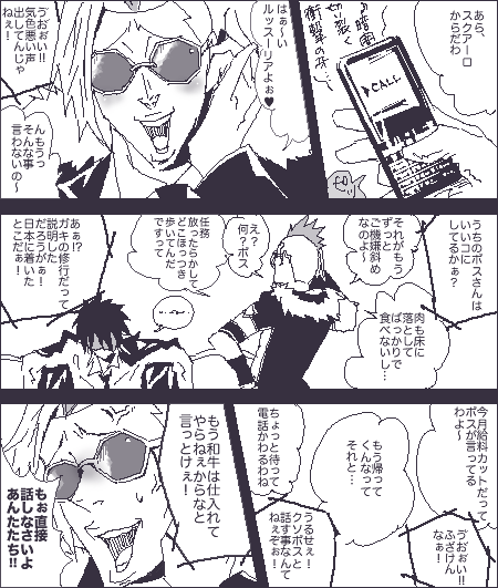 LayercakeボスとドカスのDV劇場 らくがきばかりですが まぁゆっくりしてけやPAGE | 52 53 54 55 56 57 58 59 60 | ADMIN | WRITE 2009.05.18 Mon 22:37:54 剣と剣がぶつかり合う音を知る為に託された剣じゃないよそんな矛盾で誰を守れるの隙を見てはサーチでXSサイトさま巡りをしてるんですけど、無双と違って たっくさんあるのでシアワセを噛みしめつつもじっくり楽しむ時間がないんでゲス それでもいろいろと萌えを補給させてもらったんですが、もっぱらのマイブームは ややシリアスめなザンスクであります^^リング戦後あたりで、オレはまたアイツを 救えなかった役立たずだぁ涙的な弱気スクアーロとか超 萌 え る ^^ 脳内ネームはきってみてるんですが、何とか形にできるといいなぁ時間があれば... うう...みんなはこんな余裕のない大人になっちゃ だめだぜ! 拍手ありがとうございます^^お礼絵もそのうち... PR 2009.05.17 Sun 17:49:16 恋のダイヤル6700「…ボス?」 「……」 「う”お”ぉい聞いてんのかぁ?」 「…腹減った」 「肉は買って帰るから暴れないで待ってろぉ」 「………わかった」 「ん?じ、じぁなぁ切るぞぉ」 (めずらしく素直じゃねぇか…調子狂うぜぇ) おお!文才無さすぎ^^ 拍手ありがとうございますー 大阪人なんでインフルが怖い。 2009.05.16 Sat 22:40:19 どーでもいい事並べて Happyな言葉遊び実は二人ともお互いと電話するのは何か気恥ずかしくて嫌だったりして と思いながら描いた^^ 拍手ありがとうございます! 2009.05.15 Fri 21:15:23 無駄だらけのそんな君の世界が好きヤりたいならさっさとブチこんで終わらせればいいのに、前フリ的な こういうのは何だか苦手だぁ な乙女(とかいでドカスと読む)の図 ボス的には何年経っても変わりばえしねぇヤツだ と 毎回初々しいドカスの様子に満足だといいです。なんだそれ... 微妙なのでボツにするつもりが、あまりにXS度が低いので晒しますよ。 もっとこう、やんちゃで喧しくて毒々しくて電波なのに、よく見たらコイツ 美 じゃね?な感じに描きたいんですけど精進します。 こないだテレビで鮫特集やってて、出てた鮫マニアの写真家のじいちゃんが 鮫は確かに危険だけれども美しい と言ってた。我もそう思う^^ 拍手ありがとうございます! 2009.05.13 Wed 22:06:20 この世の荒波が呼んでる最近リアルがちっとも充実してねぇ〜と山ヒバ萌の友が日記でかいてたんですけど ふと自分の事を省みてみると、アンニュイな気分になってしまったですよ... 人それぞれですけど、リア充って何かなーなんて 平日は会社いってヒィヒィ働いて、あっという間に週末が来て、平日できない雑用で 土日が終わってまた月曜...何が不満てわけでもなく、高望みしても下を見ても キリがない...まぁ人生、大なく 小なく 並がいい~ ということですよね さすが委員長!委員長は並じゃないと思うけど^^ 要はリフレッシュが足りないんだぁと思ったので、服を衝動買いしたら これは霧の守護者の幻術か!な金額に^^ 適度な息抜きをしておかないと暴走するので危険と痛感しました。 今はなんか美味しいもんが食べたい。 どうでもいいですけど私マグロは苦手です。カルパッチョとか無理^^ 拍手ありがとうございます^^ 漫画的なものも描いていきたいなぁと思ってるんだぜぇ! |